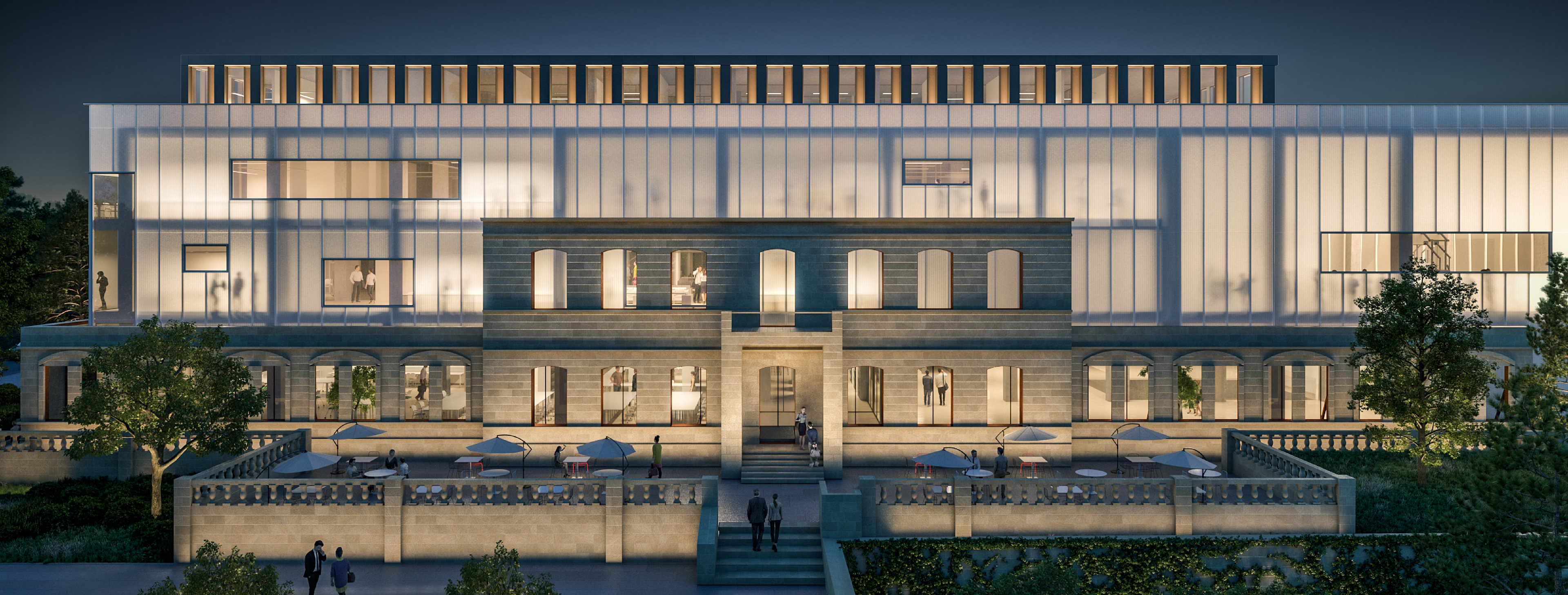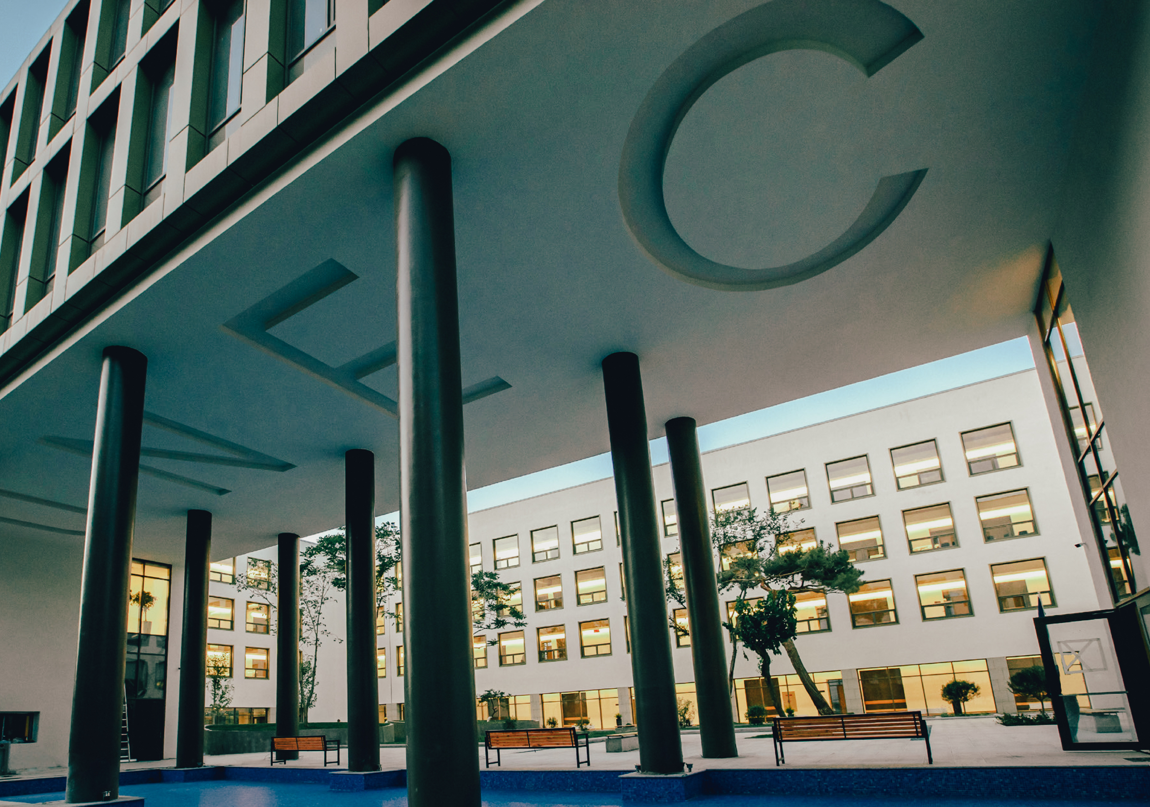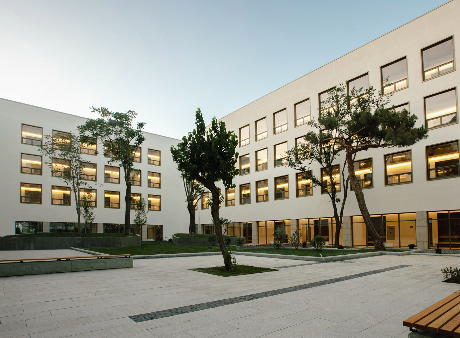 The Campus is perceived widely from the north side which is the lower-level city perspective. The green parc zone in front of the building connects with the other green zones of the city creating a very wide city perspective. The secondary courtyard that we can create in the south side of the campus is a smaller perspective with a smaller historical angle and approach.
