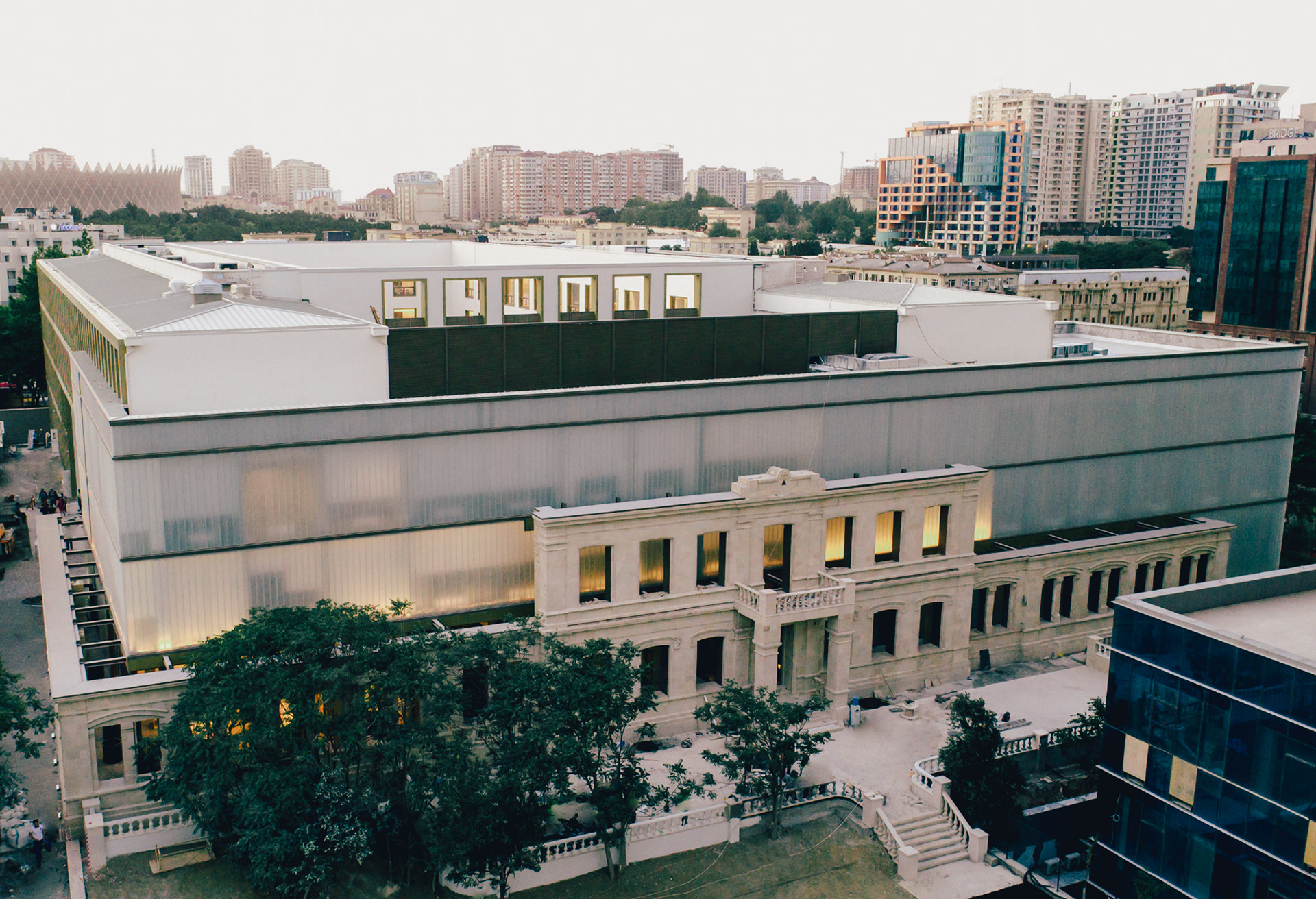 The site is surrounded by 3 main high-rise buildings. Karat Business Center is placed opposite the existing entrance, the Golden Pay LLC building is on the south of the site and Caspian Palace Hotel is on the East. The building is perceived well from the overpass main road Bakixanıv Street. Our site is offset from the main road with a park buffer zone.